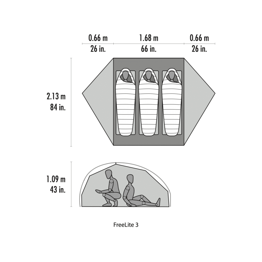 Die rechteckige Grundfläche der 2,13 × 1,68 m großen Nutzfläche (3 Personen) bietet ausreichend Platz für drei moderne, breite Isomatten. Die Innenhöhe von 109 cm ermöglicht bequemes Sitzen.