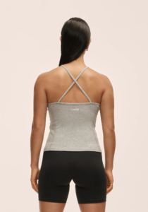 Das weichste, gerippte Top mit Halterneck-Design und dünnen, gekreuzten Trägern. Perfekt für entspannendere Yogaklassen, Studiositzungen und mehr. Es ist aus einem dehnbaren, recycelten Stoff mit einem leichten Glanz gefertigt.