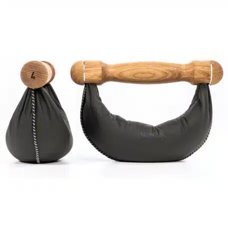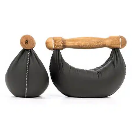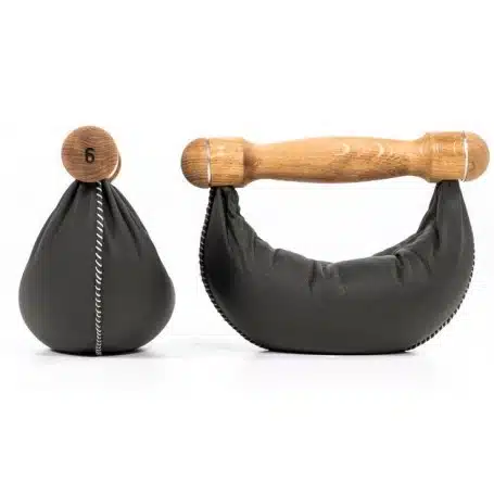 Griffe aus edlem Holz, umhüllt von handgenähtem Echtleder - acht Swing Hanteln (2er Set: 2, 4, 6, 8 kg) werden platzsparend am Swing Tower aufbewahrt.